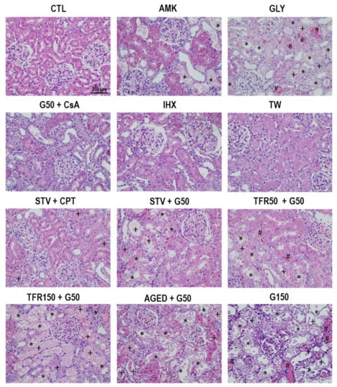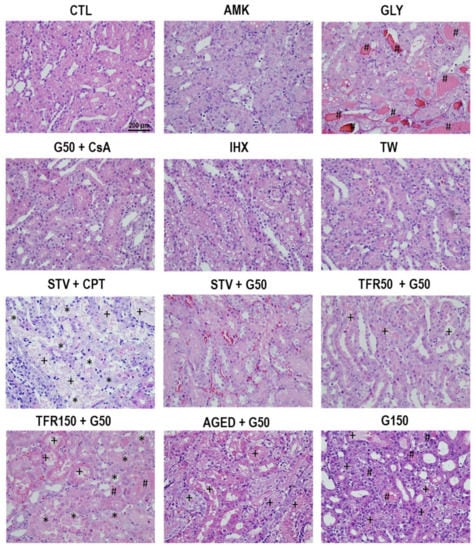 Outer medullary histology. Representative images of the renal outer medulla of rats from the AKI models included in the study. (+ luminal debris, * tubular necrosis, # tubular obstruction).