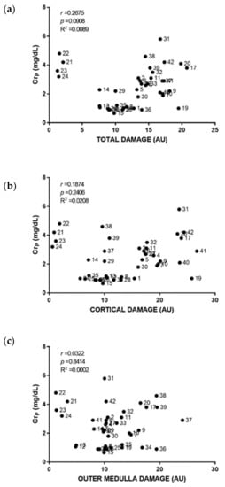 Plasma creatinine to renal damage relationship. Scatter plots showing the relationship between plasma creatinine concentration (Crp) with overall renal tissue damage (a), renal cortical damage (b), and outer medullary damage (c) of individual rats. AU: arbitrary units. p: Spearman’s correlation p-value. r: Spearman’s correlation coefficient. R2: linear regression coefficient of determination.