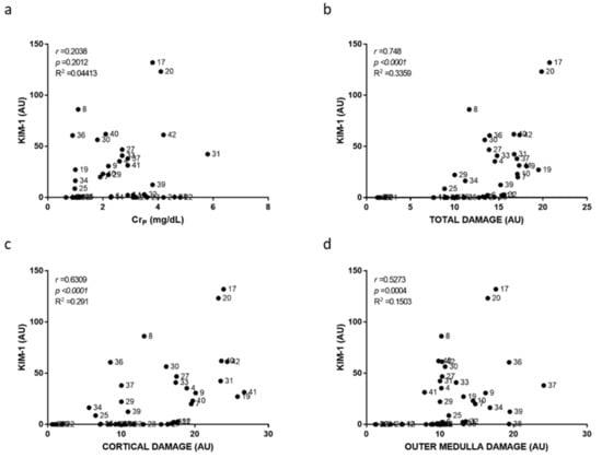 Urinary KIM-1 to plasma creatinine and to renal damage relationships. Scatter plots showing the relationship of urinary KIM-1 level with plasma creatinine concentration (Crp) (a), with the overall renal tissue damage (b), with renal cortical damage (c), and with outer medullary damage (d) of individual rats. AU, arbitrary units. p: Spearman’s correlation p-value. r: Spearman’s correlation coefficient. R2: linear regression coefficient of determination.