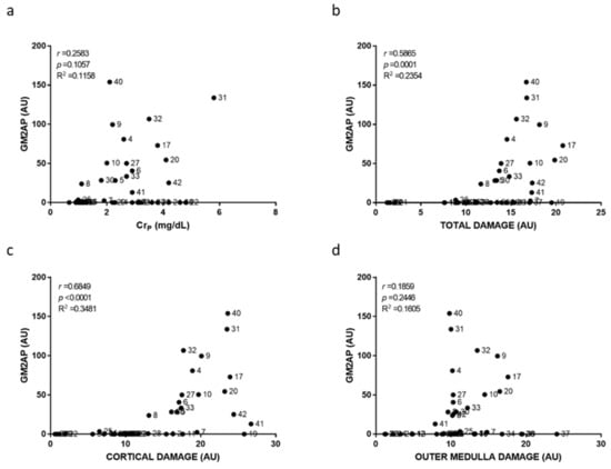 Urinary GM2AP to plasma creatinine and to renal damage relationships. Scatter plots showing the relationship between urinary GM2AP levels and plasma creatinine concentration (Crp) (a), overall renal tissue damage (b), cortical damage (c), and outer medullary damage (d) of individual rats. AU: arbitrary units. p: Spearman’s correlation p-value. r: Spearman’s correlation coefficient. R2: linear regression coefficient of determination.