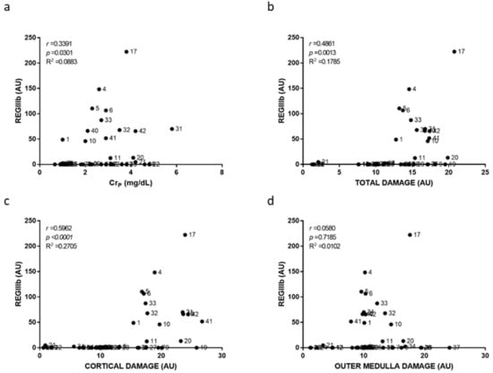 Urinary REGIIIb to plasma creatinine and to renal damage relationships. Scatter plots showing the relationship between urinary REGIIIb levels and plasma creatinine concentration (Crp) (a), with the overall renal tissue damage (b), renal cortical damage (c), and outer medullary damage (d) of individual rats. AU: arbitrary units. p: Spearman’s correlation p-value. r: Spearman’s correlation coefficient. R2: linear regression coefficient of determination.