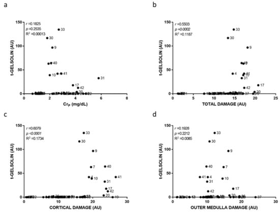 Urinary t-gelsolin to plasma creatinine and to renal damage relationships. Scatter plots showing the relationship between urinary t-gelsolin levels and plasma creatinine concentration (Crp) (a), overall renal tissue damage (b), renal cortical damage (c), and outer medullary damage (d) of individual rats. AU: arbitrary units. p: Spearman’s correlation p-value. r: Spearman’s correlation coefficient. R2: linear regression coefficient of determination.