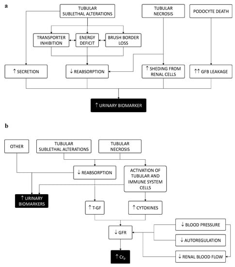 (a) Mechanisms potentially involved in increased biomarker urinary excretion. (b) Interplay between mechanisms causing reductions in GFR and those leading to increased biomarker excretion. Crp: plasma creatinine concentration. GFB: glomerular filtration barrier. GFR: glomerular filtration rate. T-GF: tubule-glomerular feedback. ↑: increase. ↓: decrease.