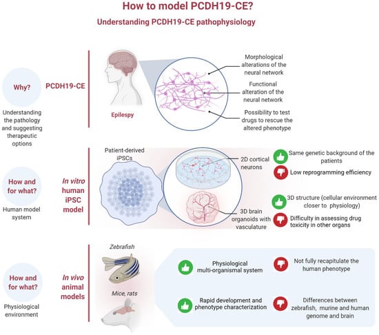 The study of neurodevelopmental disorders, such as PCDH19-CE, needs informative models for exploring the processes mediating neuronal development and function. Unfortunately, genetically modified animal models have failed to recapitulate critical aspects of the human disease, including the occurrence of seizures [56,57]. Previous studies with zebrafish and murine models (summarized in Table 1) have underlined a role for protocadherin 19 in early embryonic neurodevelopment, but these models have not been informative for the study of the cellular pathways implicated in the epileptic phenotype characterizing PCDH19-CE [16,17,21]. While a single study reported some behavioral defects in heterozygous animals, such as a decrease in the fear response and slight hyperactivity (particularly in response to stress) [21], other analyses focused on other behavioral/cognitive features (e.g., anxiety, social interaction, working and spatial memory) failed to detect any differences between heterozygous females and the controls [21]. Moreover, while cortical structural abnormalities have been identified in patients [14,15,16,17,18], no gross morphological alterations were found in the brains from mouse models [16,17,21]. Several animal models (i.e., zebrafish and murine models) have been used for the study of several neurodevelopmental pathologies (Table 1), as they rapidly recapitulate embryogenesis and offer the possibility of quickly characterizing the phenotype of interest in addition to representing a physiological multi-organ system. Despite these advantages, they may not faithfully recapitulate the clinical features and the severity of human PCDH19-CE (Figure 1).