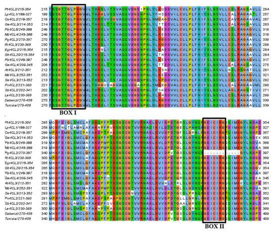 The emergence of lignin enables terrestrial plants to stand upright and transport water for a long distance. Flavonoids are a crucial class of secondary metabolites of plants [1]. These two metabolites participate in regulating various physiological functions and improving the adaptability to environmental stress [2,3]. The 4CL gene can encode multiple enzymes and exhibit distinct substrate affinities that appear to coincide with different metabolic functions [4]. Different 4CL isozymes can selectively catalyze cinnamic acid, p-coumaric acid and other substances to produce corresponding CoA thioesters. Some CoA thioesters can be synthesized by cinnamoyl-CoA reductase (CCR), and cinnamyl alcohol dehydrogenase (CAD) catalyze the reaction into the specific pathway of lignin biosynthesis [5], or through chalcone synthase (CHS) and chalcone isomerase (CHI) to guide the reaction into the specific pathway of flavonoid biosynthesis [6]. Members of the 4CL gene family have now been identified in several species, such as Arabidopsis [7], rice [8], cotton [9], Eucalyptus grandis [10], and pear [11]. The 4CL proteins all contain two amino acid conserved structural domains: Box I (SSGTTGLPKGV) and Box II (GEICIRG) [12]; Box I is the AMP-binding functional domain, and this region is not only conserved in 4CL but is also a conserved sequence typical to all acyl-activated enzymes, and can be directly involved in the catalytic reaction, whereas Box II is only highly conserved in 4CL and is not directly involved in the catalysis; it may be related to the spatial conformation of the enzyme [13].