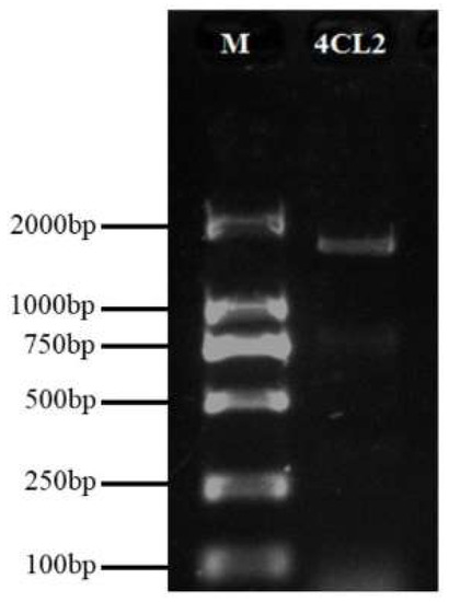 Detection of Pg001327.1 PCR products by electrophoresis. Note: M: DL2000 DNA Marker; 4CL2: Target gene.