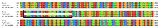 Multiple alignments of Pg001327.1, XP_031382283.1 and sequencing results. This square represented that Pg001327.1 was missing 36 nucleotides within positions 1404–1439 bp.