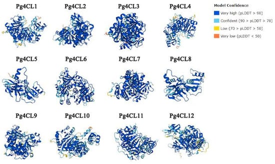 Tertiary structure of Pg4CL proteins. The tertiary structure of the protein was predicted through the AlphaFold. Model confidences are indicated by different colors. Blue, light blue, yellow, and red represent very high, confident, low, and very low confidence, respectively.