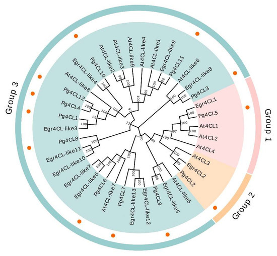 Multiple sequences alignment was performed by MAFFT [39] using a total of 38 full-length protein sequences, including Arabidopsis thaliana (At, 13 sequences), Punica granatum (Pg, 12 sequences), and Eucalyptus grandis (Egr, 13 sequences). To investigate the phylogenetic relationships of the 4CL proteins, MEGA7.0 software [44] was used to construct a phylogenetic tree using the NJ method, Bootstrap 1000 repeats, and the others were set as default parameters. The online software EvolView (https://evolgenius.info/ (accessed on 11 February 2022)) was used to beautify the evolutionary tree [45]. According to the 4CL classification of Arabidopsis and E. grandis, Pg4CLs were classified and predicted.