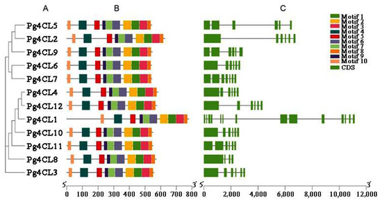 Phylogenetic tree, conservative protein motifs and gene structure of the Pg4CLs in pomegranate. (A) The phylogenetic tree of 12 Pg4CLs. (B) Conserved motifs in the 12 Pg4CLs. The motifs were identified by the MEME Suite. Different conserved motifs, numbers 1–10, are displayed in different colored boxes. (C) Gene structures of the 12 Pg4CLs.