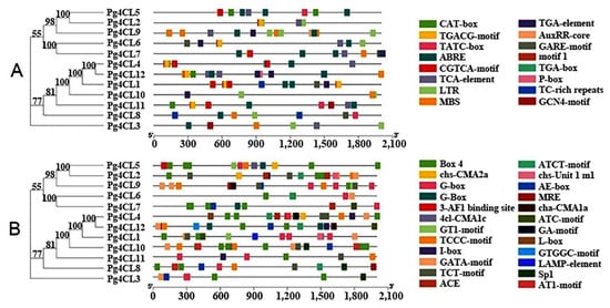 The cis-acting elements are the binding sites of transcription factors and play a crucial role in regulating gene expression function. Visualizing the identified cis-acting elements of Pg4CLs, all Pg4CLs contained at least one phytohormone response element (Figure 7A), including abscisic acid response element (ABRE), growth hormone response elements (TGA-element, AuxRR-core, TGA-box), MeJA response elements (CGTCA-motif, TGACG-motif), gibberellin response elements (TATC-box, GARE-motif, P-box), and salicylic acid response elements (TCA-elements). TGA-element was an auxin-responsive element and TGA-box was part of an auxin-responsive element. Among the 12 Pg4CLs, 8 contained MeJA response elements, 6 contained gibberellin response elements, 10 contained abscisic acid response elements, 9 contained salicylic acid response elements, and 7 contained auxin response elements. There were also low-temperature response elements (LTR) and drought response elements (MBS) in the promoter regions of some Pg4CLs, 6 contained LTR and 6 contained MBS. These Pg4CLs may respond to plant biotic and abiotic stresses. In addition, there was an MYB binding site (MBSI) involved in gene regulation of flavonoid biosynthesis in the promoter region of the Pg4CL6. Some Pg4CLs promoter regions also contained regulatory elements, such as endosperm expression (GCN4_motif) and meristem expression-related (CAT-box) (Figure 7A). These Pg4CLs may be closely related to plant growth and development. In addition, G-box and G-Box were cis-acting regulatory elements involved in light responsiveness. The binding sites of G-box and G-box transcription factors were different, the former was CACGTG and the latter was CACGTT. A total of 24 light-responsive elements appeared in this study (Figure 7B), of which the promoter regions of the Pg4CLs all contained a large number (5–17) of light-responsive elements, indicating that the Pg4CLs may be regulated by light.