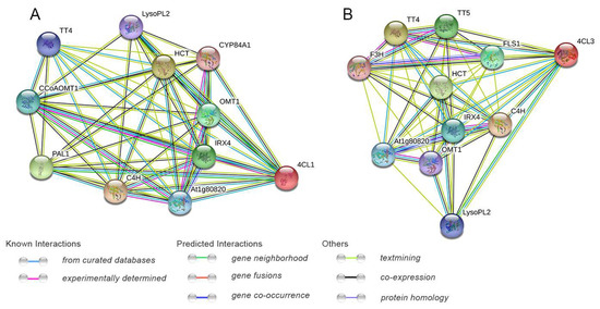 Function interaction network of Pg4CL5 (A)/Pg4CL2 (B) proteins. Note: TT4: chalcone synthase; CCoAOMT1: caffeoyl coenzyme A-O-methyltransferase; At1g80820: cinnamoyl-CoA reductase 2; C4H: cinnamate 4-hydroxylase; IRX4: cinnamoyl-CoA reductase 1; PAL1: phenylalanine ammonia-lyase 1; OMT1: flavone 3′-O-methyltransferase 1; HCT: shikimate O-hydroxycinnamoyltransferase; CYP84A1: ferulate 5-hydroxylase; LysoPL2: caffeoyl shikimate esterase; TT5: chalcone-flavanone isomerase; F3H: flavanone-3-hydroxylase; FLS1: flavonol synthase.