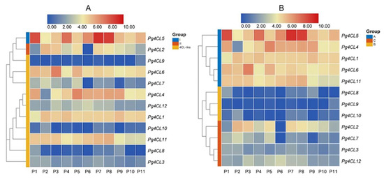 Heatmap of Pg4CLs gene expression in different tissues. Note: (A) Gene expression patterns of different subfamilies genes; (B) hierarchical clustering of gene expression patterns. P1: root; P2: leaf; P3: flower; P4, P7, P8: pericarp; P5: exocarp; P6, P9: pericarp; P10–P11: a mixture of flowers, leaves, fruits, and roots (cultivars P1–P6 are ‘Dabenzi’, cultivars P7, P8, P9, and P10 are ‘Tunisia’, ‘Baiyushizi’, ‘Wonderful’, ‘nana’ and ‘Black127’, respectively.