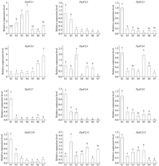 Relative expression levels of 12 Pg4CL from the pericarp during fruit development. Note: the seven stages of fruit development were S1–S7, and the specific dates of the seven stages were 15 July, 28 July, 10 August, 23 August, 5 September, 18 September, and 1 October, respectively. The vertical bar in the bar graph is standard error. Bars with different letters (a–d) indicate significant differences at p < 0.05 according to Duncan’s test.