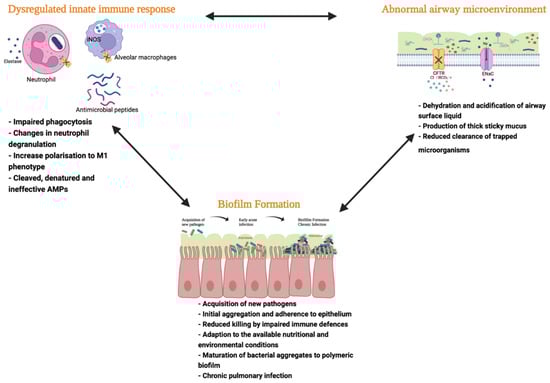 Factors contributing to an increased risk of airway infection in Cystic fibrosis (CF). Aberrant airway microenvironment driven by defective cystic fibrosis transmembrane conductance regulator (CFTR) function results in dehydration and acidification of the airway surface liquid (ASL), impairing mucociliary clearance (MCC), and renders host innate defences ineffective. Acquisition of new microorganisms within the CF lung leads to the development of acute bacterial infections. Defective CF host immune responses result in reduced killing of bacteria, providing an opportunity for bacterial adaption to nutritional and environmental conditions within the airways. Such adaptations may include the downregulation of virulence factors such as flagellin and type 3 secretion systems, enabling a shift from planktonic bacterial infection to biofilm formation. This is particularly common in P. aeruginosa infections. Formation of the complex polymeric biofilm matrix makes it very difficult to eradicate these organisms, leading to the development of chronic pulmonary infections. The cumulative impact of the intrinsic defective CFTR function on the airway microenvironment, host innate defences, and the ability of bacterial pathogens to adapt to their environment and grow in a multicellular and sessile form (biofilms) leaves the CF lung highly permissive to airway infection.