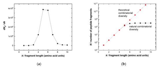 (a) Comparison of the number N of unique fragments of the complete combinatorial library (red line with circles) with the number Np of unique fragments of the human peptidome (black line with squares) depending on the length of the peptide fragment. Starting from the 6-mer peptide, Np tends to saturate; (b) entropy gain dNp/dk versus the length k of the peptide sequence.