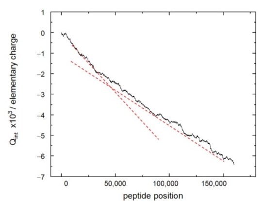 The distribution of the peptides of the resemblance-ranking peptide library according to the scores does not correlate with the peptide sum hydrophobicity, sum molecular weight, and sum helix propensity. Interestingly, the resemblance-ranking library has an integral negative charge considering that the occurrence of positively charged amino acids (Arg, His, Lys) is higher than those negatively charged (Asp, Glu) in the peptidome (Figure 2). According to the negative charge, the entire resemblance-ranking library is divided into two groups: the first 30,000 peptides have greater negativity (greater slope of the red dotted line in Figure 2) than the rest.