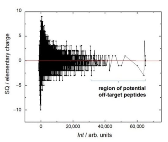 Even though the library itself is integrally negatively charged, during the screen the most intense interaction of RTX was observed with peptides, the total charge of which is no more than two (Figure 3). Moreover, the sign of this charge does not matter. This trend can be seen in the example of the positively charged amino acids arginine (R) and lysine (K) and negatively charged amino acids glutamate (E) and aspartate (D) (Figure 4). In the region of the strongest signals, where off-target sequences are expected, strong charge oscillations are observed, which may reflect the specificity of the rituximab paratope.