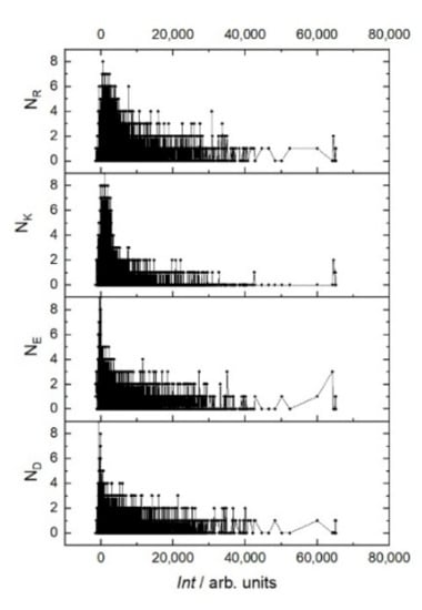 Fluorescent intensity Int of RTX interaction with the resemblance-ranking peptide library versus the number N of positively charged amino acids R and K and negatively charged amino acids E and D of the corresponding peptides.