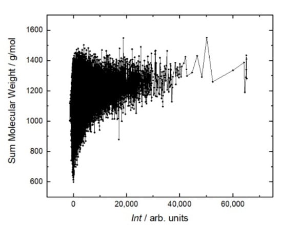 Fluorescent intensity Int of RTX interaction with the resemblance-ranking peptide library versus the sum molecular weight of the corresponding peptides.