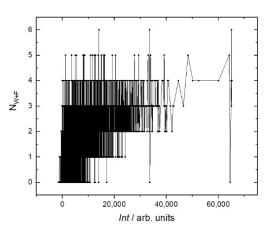 Fluorescent intensity Int of RTX interaction with the resemblance-ranking peptide library versus the number of sum of hydrophobic amino acids W and F of the corresponding peptides.