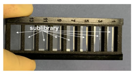 Peptide microarrays: A peptide library of 160,000, peptides as well other peptide microarrays for the substitutions and the KD analysis, were fabricated via the ultra-high-density peptide microarray technology of AXXELERA (Karlsruhe, Germany) []. The AXXELERA technology allows for the 30 µm-sized square peptide spots with a pitch of 60 µm that corresponds to ca. 28,000 spots/cm2.