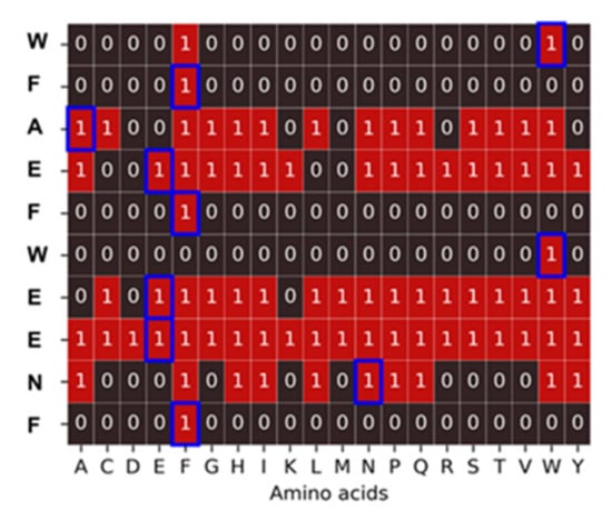 Substitution analysis for the peptide WFAEFWEENF. The blue frames correspond to the amino acids of the peptide under study. Squares show the corresponding fluorescent signal for all substitution sequences. In the case of red squares, the signal is equal to or higher than the signal from the original sequence. The epitope is composed of a combination of the invariant amino acids, W and F: W/FFxxFWxxxF.