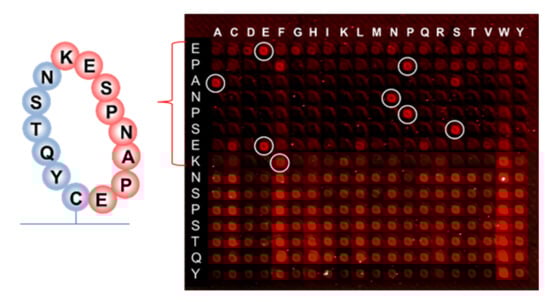 H.B. Larman et al. constructed a synthetic representation of the complete human proteome for the discovery of unreported autoantibodies, which were engineered as peptides on the surface of T7 phage []. However, phage display screenings are notorious for the identification of false-positive hits []. These emerge for two important reasons: binding to non-target-related materials used during selection and propagation advantages []. Often, hits from phage display screening are validated, for example, using peptide microarrays to find invariant amino acids via substitutional analysis [,] or to determine the affinity and the serological number of peptide–antibody interactions in peptide array format []. Knowledge of invariant amino acids in epitopes contributes to a more targeted search for antigens in proteomic databanks.