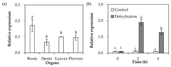 SgDREB2C transcript was detected in roots, stems, leaves and flowers of S. guianensis. The data showed that the highest transcript level was in roots compared with the other tissues (Figure 3a). After dehydration treatment, SgDREB2C transcript was induced and reached the maximum level at 2 h, with 16-fold higher expression than in the unstressed control (Figure 3b).