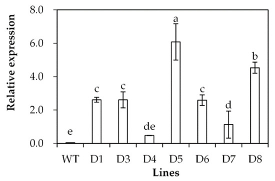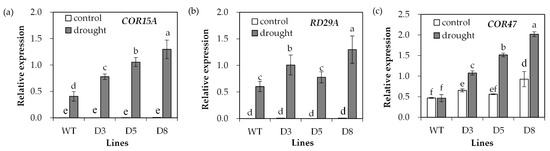 Transcript levels of stress-responsive genes were analyzed. COR15A and RD29A transcript levels showed no difference between transgenic plants and WT under control conditions, but they were greatly induced after drought treatment (Figure 8a,b). Higher levels of COR15A transcript were observed in transgenic plants under drought stress (Figure 8a), and transgenic lines D3 and D8 but not D5 had higher RD29A transcript levels than WT plants (Figure 8b). The COR47 transcript level was higher in transgenic lines D3 and D8 than in WT under control conditions. It was greatly induced in transgenic plants after drought treatment, but not altered in WT plants (Figure 8c).