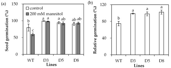 Seed germination in transgenic plants in comparison with the wild type (WT) in response to osmotic stress. Sterilized seeds were placed on 1/2 MS medium containing 200 mM mannitol or without it as control for 4 days for determination of germination rate (a), and the data were used to calculate relative germination rate (b). Means of three replicates and standard errors are presented; the same letter above the column indicates no significant difference at p < 0.05.