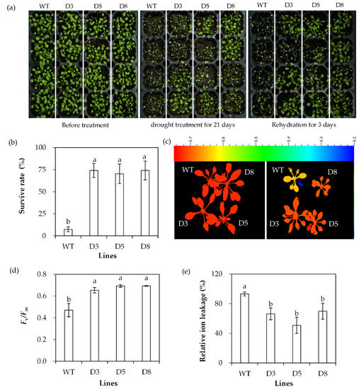 Analysis of drought tolerance in transgenic plants in comparison with the wild type (WT). Two-week-old seedlings were withheld from irrigation for drought treatment. Photos were taken at the time points as indicated in the figure (a). Survival rate was determined after 21 days of drought, followed by 3 days of rewatering (b). Fv/Fm (c,d) and relative ion leakage (e) were determined after 14 days of drought. Means of three replicates and standard errors are presented; the same letter above the column indicates no significant difference at p < 0.05.