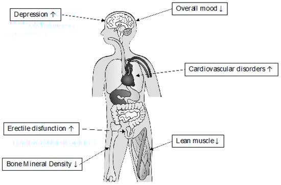 As result, the use of testosterone replacement therapy (TRT) in clinical practice has been an appealing perspective. However, the issue related to the potential adverse effects of TRT, and in particular its impact on cardiovascular events and mortality, have represented a controversial topic of discussion. Despite those concerns, recent studies have reported non-consistent results regarding the relationship between TRT and increased risk of diabetes, obesity and metabolic syndrome. Contrarily, an adequate replacement therapy appears to improve sexual and physical function, increase bone density and, most importantly, not influence the risk of prostate cancer []. In addition, different studies have shown how low endogenous testosterone levels may be associated with reduced cognitive ability and how TRT could help in avoiding cognitive dysfunction associated with hypogonadism [,]. Considering the potential benefits of TRT, and, bearing in mind as well, the wide variability of testosterone values and comorbidities in the elderly, TRT should be individualized. The aim of our review is to provide an updated background regarding the pros and cons of TRT, evaluating its role in different domains and its clinical applicability.