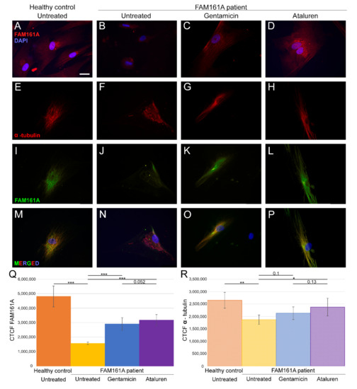 FAM161A expression and co-expression with α-tubulin in fibroblast cells. (A–D) FAM161A expression (red) after 48 h of starvation in cells from a healthy control (A), cells from FAM161A patient without treatment (B), following Gentamicin treatment (C) and Ataluren treatment (D). Double staining of α-tubulin (red) and FAM161A (green) in starved fibroblasts from healthy control cells (E,I,M), untreated fibroblasts from FAM161A patient (F,J,N) and cells from the same patient treated with Gentamicin (G,K,O) and Ataluren (H,L,P). DAPI: nucleus (blue). Scale bar 25 µm. (Q,R) Quantification of FAM161A (Q) and α-tubulin (R) expression levels in fibroblasts. Fluorescence intensities of FAM161A and α-tubulin in healthy untreated cells (orange) and untreated (yellow) Gentamicin-treated (blue) and Ataluren-treated (purple) cells from patients were measured using ImageJ, and the corrected total cell fluorescence (CTCF) was calculated (arbitrary units). The significance levels were set when p < 0.05 (*), p < 0.01 (**), p < 0.001 (***).