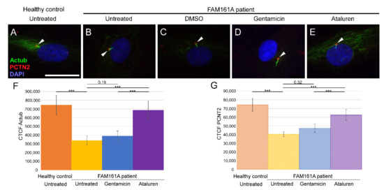 Ciliogenesis in fibroblast cells of FAM161A patients following TRID treatment. Immunofluorescence analysis of fibroblast cells from healthy controls (A) and FAM161A patient cells (B–E) after triggering ciliogenesis by starvation for 48 h. Antibodies against acetylated tubulin (Actub, green) marker for cilia, pericentrin (PCTN2, red) stains the basal body, and nuclei are stained by DAPI (blue). Cilia are marked with white arrows. FAM161A patient cells were left untreated (B), or treated with DMSO as control (C), Gentamicin (D) or Ataluren (E). Scale bar 25 µm. (F,G) Quantification of Actub (F) and PCNT2 (G) expression levels in fibroblasts. Fluorescence intensities of Actub and PCNT2 in healthy untreated cells (orange) and untreated (yellow) Gentamicin-treated (blue) and Ataluren-treated (purple) cells from patients were measured using ImageJ, and the corrected total cell fluorescence (CTCF) was calculated (arbitrary units). The significance levels were set when p < 0.001 (***).