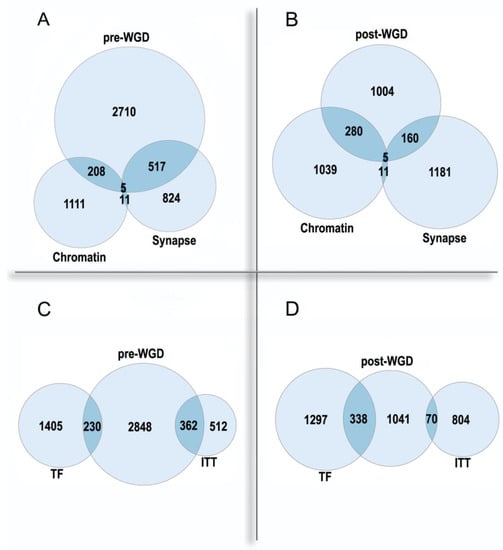 The enrichment of pre-WGD and post-WGD human ohnologs in functional gene groups. (A,B)—nuclear chromatin GO:0000790 and synapse GO:0045202. Chromatin: underrepresentation p < 0.01 in pre-WGD, enrichment p < 10−61 in post-WGD. Synapse: enrichment p < 10−71 in pre-WGD; enrichment p < 10−8 in post-WGD. (C,D)—transcription factors (TF) and ion transmembrane transporter activity GO:0015075 (ITT). TF: underrepresentation p < 10−7 in pre-WGD, enrichment p < 10−74 in post-WGD. ITT: enrichment p < 10−56 in pre-WGD, not significant p > 0.4 in post-WGD. Albeit both pre-WGD and post-WGD ohnologs are enriched in the synapse genes, there are significant differences in binomial proportions between pre-WGD and post-WGD ohnologs (p < 10−15). The pre-WGD and post-WGD ohnologs were from []. The transcription factors were from [].