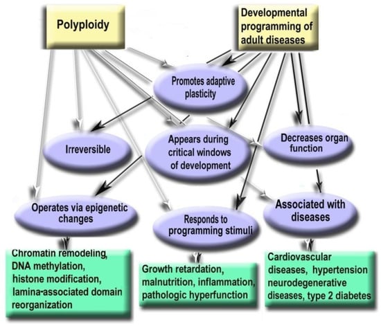 - Excessive polyploidization can be associated with the diseases that usually originated from the developmental programming, including cardiovascular disease, hypertension, neurodegenerative disease, type 2 diabetes, metabolic syndrome, and others [,,,,,,].