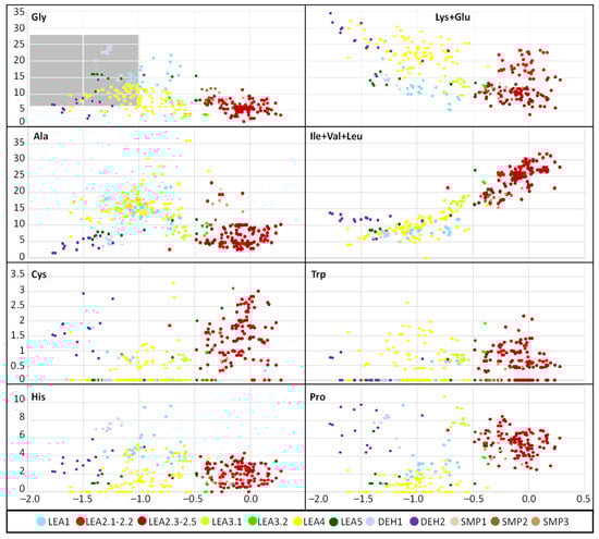 | LEA Protein Group | aa # | Calculated pI | Mw (kDa) | GRAVY Index | Amino Acid (aa) Composition | ||||