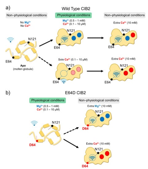 - Vallone, R.; Dal Cortivo, G.; D’Onofrio, M.; Dell’Orco, D. Preferential Binding of Mg(2+) Over Ca(2+) to CIB2 Triggers an Allosteric Switch Impaired in Usher Syndrome Type 1J. Front. Mol. Neurosci. 2018, 11, 274. [Google Scholar] [CrossRef]