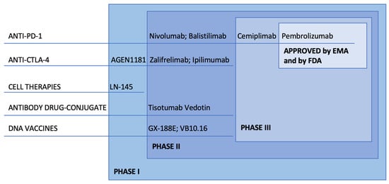 Very promising and interesting results have been obtained in various applications of immunotherapy; as of now, the class of compounds that has advanced the most in research is immune checkpoint inhibitors (ICI), with several phase II and III trials currently ongoing (Table 1).