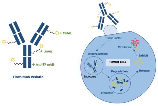 Tisotumab-Vedotin (Figure 3) is a first-in-class ADC, comprising a tissue factor (TF)-specific, fully human monoclonal antibody conjugated to a microtubule-disrupting agent monomethyl auristatin E (MMAE) using a protease-cleavable linker. Tisotumab-Vedotin has shown activity both in vitro and mouse xenografts, by delivering MMAE to TF positive cells and inducing both direct cytotoxicity, as well as bystander killing, with minimal disruption of the coagulation cascade. Moreover, the compound was also able to stimulate immunogenic killing via Fcγ-mediated antibody-dependent cellular cytotoxicity (ADCC) and antibody-dependent cellular phagocytosis (ADCP) [60].