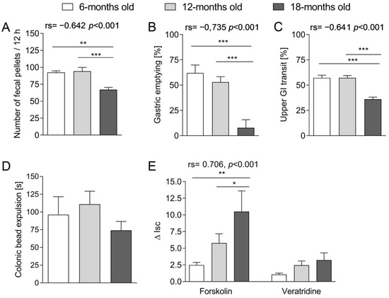 The evaluation of the age-related changes in the mouse GI tract. Panels from (A–D) present the alterations in the GI peristalsis: number of fecal pellets excreted over 12 h (A), gastric emptying (B), upper GI transit (C) and colonic transit (D) in 6-, 12- and 18-month old mice. (E) includes the comparison of the change in short circuit current (ΔIsc) between 6-, 12- and 18 month- old mice after stimulation with forskolin (10−5 M; left side of the figure) and veratridine (3 × 10−5 M, right side of the figure). One-way analysis of variance (ANOVA) followed by Bonferroni correction test was used to evaluate the difference between groups. Bars represent mean ± SEM. For significant association between age and given variables (A–D). Spearman’s rank correlation coefficient (denoted as rs) was presented. * p < 0.05, ** p < 0.01, *** p < 0.001.