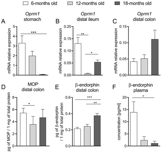 The mRNA expression of the Oprm1 gene, encoding MOP receptor, in the stomach (A), distal ileum (B) and distal colon (C). Theprotein expression of MOP receptor (D) and β-endorphin (E) in the colon, the concentration of β-endorphin in the plasma (F) of 6-, 12- and 18-months old mice. Welch ANOVA test followed by Tamahane’s T2 multiple comparison test was used to evaluate the difference between groups (A–C). One-way ANOVA followed by Bonferroni correction test was utilized for multiple comparison in case of block (C,D). * p < 0.05, ** p < 0.01, *** p < 0.001.