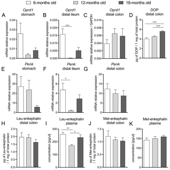 The mRNA expression of the Oprd1 gene, encoding DOP receptor, in the stomach (A), distal ileum (B) and distal colon (C). The protein expression of DOP receptor (D) in the distal colon. The mRNA expression of Penk in the stomach (D), distal ileum (E) and distal colon (F). The protein expression of endogenous enkephalins: Leu-enkephalins (H,I) and Met-enkephalins (J,K) in the distal colon and in the plasma of 6-, 12- and 18-months old mice. Differences between groups were tested with one-way ANOVA followed by Bonferroni corrections for multiple comparisons apart from block (A) where Welch ANOVA test followed by Tamahane’s T2 was used, block (C,G) where Kruskal–Wallis test was applied with post hoc Dunn’s multiple comparisons test. * p < 0.05, ** p < 0.01, *** p < 0.001.