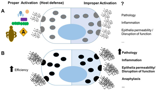 Mast cells in host defense and pathology: (A) mast cells have recognized roles in immunity against pathogens and venoms (left); however, improper activation against innocuous agents or dysregulated activation may lead to pathology (right); (B) mast cells that host genetic factors and mutations, possibly promoted by benefits of survival, more efficiently clear pathogen and venoms (left); however, they can lead to a more severe pathology under inappropriate activation (right).