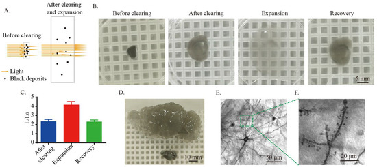 Rapid clearing of Golgi-Cox-stained tissue. (A) Schematic diagram showing that expansion of the Golgi-Cox-stained tissue increased light transmission. (B) Representative photos showing clearing, expansion, and recovery of 1 mm thick Golgi-Cox-stained tissue. The cleared samples were incubated in DI water for expansion. Otherwise, the samples were incubated in PBS. The 1 mm thick slices were cleared in the clearing solution for 6 h at 70 °C. (C) Statistics of the linear expansion of Golgi-stained tissue during clearing, expansion, and recovery. The histogram is shown as the mean ± SEM (n = 6). (D) Expansion of Golgi-Cox-stained hemibrain of mice and the cleared tissue was expended in DI water. The hemibrain was cleared in the clearing solution for 24 h at 70 °C. (E) The neuronal cell bodies and fibers after clearing and expansion. The image was taken using transmitted light with confocal microscopy. (F) The dendritic spines after clearing and expansion. The image was taken using transmitted light with confocal microscopy.