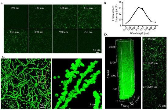 Since mercury compounds within the Golgi-Cox-stained tissue are sensitive to photoexcitation and could be excited by a two-photon laser [15], we tested whether the cleared Golgi-Cox-stained tissue can be used for two-photon imaging. We used a two-photon laser (690–950 nm at 40 nm interval) for excitation, captured using an emission filter tuned to 495–540 nm to obtain the appropriate excitation light wavelength for two-photon imaging. The signal intensity of the Golgi-Cox-stained sample was the highest when excited using an 810 nm wavelength (Figure 3A,B). Thus, this wavelength was used for two-photon imaging. By imaging the cleared Golgi-Cox-stained tissue with two-photon microscopy, the cell bodies, neurites, and dendritic spines were clearly visible (Figure 3C). Subsequently, we tested the use of two-photon imaging to perform large-scale 3D imaging of the cleared Golgi-Cox-stained tissue. For the clearing and imaging, 1 mm thick (about 2 mm thick after clearing) Golgi-Cox-stained tissues were used. We found that the cleared Golgi-Cox-stained tissue could be imaged in the entire 2 mm imaging range (Figure 3D, Movie S1), indicating that two-photon imaging could be used to perform large-scale 3D imaging of the cleared Golgi-Cox-stained tissue.