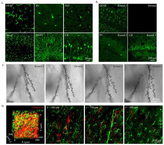 To extend the use of Golgi-Cox staining, we next investigated whether cleared Golgi-Cox-stained tissue was compatible with immunostaining. As PFA fixation is important for the immunostaining of Golgi-Cox-stained tissue [16,23], PFA-fixed brains were used for Golgi-Cox staining and then cleared with modified MAP. For the immunostaining test, 100 μm thick cleared Golgi-Cox-stained tissues were used. We selected a glial fibrillary acidic protein (GFAP) antibody to label the astrocyte; parvalbumin (PV), calbindin (CB), and somatostatin (SST) antibodies to label the different types of interneurons; and neurofilament 200 (NF-H) and microtubule-associated protein 2 (MAP2) to label cytoskeleton protein. All six of the tested antibodies worked well on the cleared Golgi-Cox-stained tissues (Figure 4A). Hydrogel embedding can fix proteins tightly and enable multi-round immunostaining [5,8]. We then performed multi-rounds immunostaining in the same slices and monitored the change in the dendritic spine labeled with the Golgi-Cox stain (Figure 4B,C). In the first round of immunostaining, we tested the GFAP antibody and found that it gave a good immunostaining result (Figure 4B). Then, we used harsh conditions (200 mM SDS, 200 mM NaCl, and 50 mM Tris in DI water; pH titrated to 9.0; 70 °C for 16 h) to destain the immunostained tissue. After destaining, the immunostaining signal fully disappeared (Figure 4B). In the second and third rounds of immunostaining, PV and CB antibodies were used for testing, and all gave good staining results (Figure 4B). Notably, the individual spine can be clearly monitored through the entire multi-round staining procedure (Figure 4C), indicating that cleared Golgi-Cox-stained tissue could be used for multi-round immunostaining without losing the Golgi-Cox-stained spine. Next, we tested whether the cleared Golgi-Cox-stained tissue could be used for 3D immunostaining in thick sections. Here, 250 μm thick (500 μm thick after clearing) Golgi-Cox-stained tissue was 3D immunostained with GFAP antibody for testing. The results show that the staining of GFAP was distributed in the entire imaging range (Figure 4D).