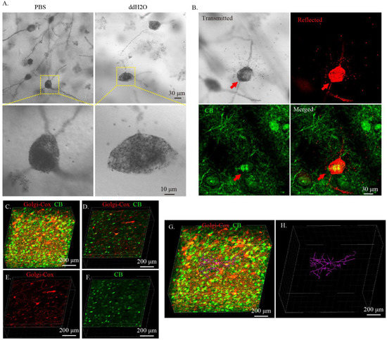 Reconstruction of specific neuron morphology in cleared Golgi-Cox-stained tissue by combining expansion and immunostaining. (A) Expansion of cleared Golgi-stained tissue with DI water. Cleared Golgi-stained tissues were incubated in either PBS or DI water. The image was obtained using transmitted light with confocal microscopy. (B) Imaging a single neuron labeled with Golgi-Cox stain and immunostaining (immunostained with calbindin antibody). The “transmitted” panel was obtained using transmitted light, The “reflected” panel was obtained using the confocal reflective mode, and the “CB” panel was obtained using the standard confocal imaging mode. (C–H) Three-dimensional reconstruction of a single neuron morphology labeled with both Golgi-stain and immunostain. The Golgi-Cox-stained signal was obtained using the confocal reflective mode of the confocal microscopy and the immunostained signal was obtained using standard confocal imaging mode. (C) Three-dimensional rendering showing the 3D immunostain of Golgi-Cox-stained tissue with CB. (D) Sectional image from (C) showing the colocation of Golgi-stained neuron with CB-immunopositive neuron. (E,F) The Golgi-stained channel and CB-stained channel of (D). (G) Reconstruction of the CB-immunopositive neuron morphology using the Golgi-Cox stain. (H) Reconstructed CB-immunopositive neuron. The reconstruction was performed using the FilamentTracer function of Imaris software and the neural fibers were tracked automatically by the software.