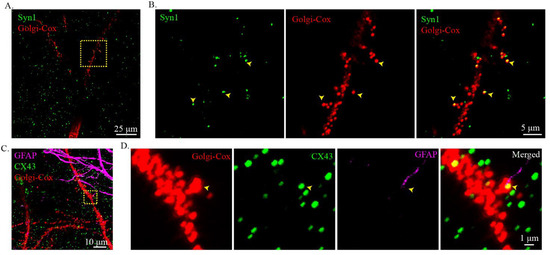 Reconstruction of the neuronal circuit at the dendritic spine level with the combination of Golgi-Cox staining and immunostaining. (A) Visualization of the connection between immunostain labeled pre-synaptic protein, Syn1, and Golgi-Cox-stain-labeled post-synaptic dendritic spines. The Golgi-Cox-stained signal was obtained using the confocal reflective mode of the confocal microscopy and the immunostained signal was obtained using standard confocal imaging. (B) Zoomed-in images from the insert in (A) showing the contact of the pre- and post-synaptic structures. The yellow arrows show the contact site. (C,D) Visualization of the connection between astrocytes and neurons. (C) Visualization of the immunostain labeled astrocyte (GFAP), gap junction (CX43), and Golgi-Cox-stain-labeled neural fibers. The Golgi-Cox-stained signal was obtained using the confocal reflective mode of the confocal microscopy and the immunostained signal was obtained using the standard confocal imaging mode. (D) Zoomed-in images from the insert in (C) showing the colocalization of the process of the astrocyte, CX43, and dendritic spine.